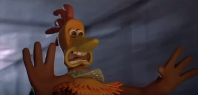 הביצה והתרנגולת, גירסת הסטופ-מושן: תרנגולות פלסטלינה (במבטא בריטי!) מתמרדות בייעודן המקורי בחיים – הטלת ביצים – ומנסות להתעופף (או להתחפף) מהקן כדי שלא לסיים על הצלחת. רוקי הגבר האמיץ נופל עליהן כמו משמיים (בעצם, למה 'כמו'?) לצורך ביצוע המשימה.